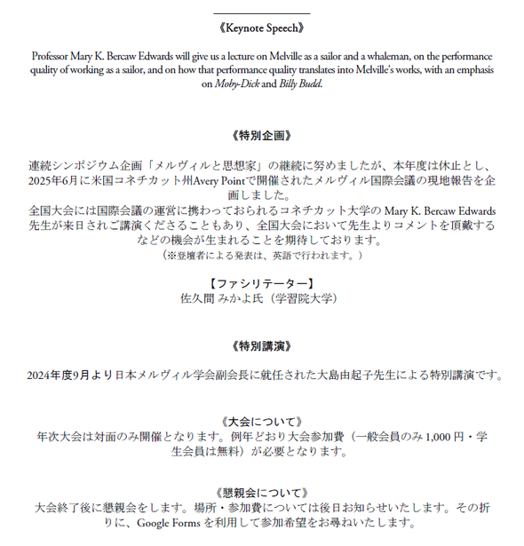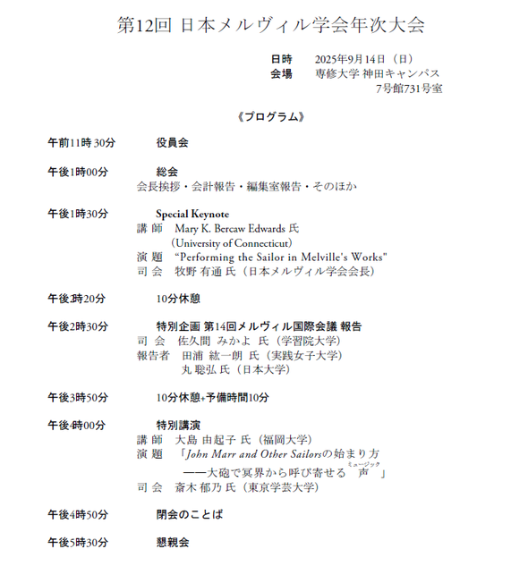 日本メルヴィル学会 事務局 〒192-0393 東京都八王子市東中野 742-1 中央大学文学部英語文学文化専攻 髙尾研究室内 電話・FAX 042-674-3741